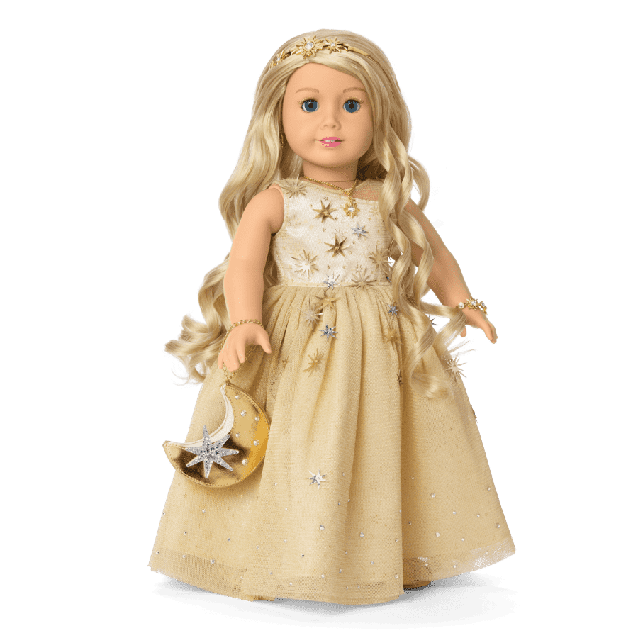 A gleaming jewel in any light, this limited-edition American Girl® 2025 holiday collector doll sparkles with celestial wonder. Her golden floor-length gown is draped in cascading stars and she glitters with more than 100 Crystal Moonlight Swarovski® crystals, mirroring the depth and glow of a night sky. This beautiful American Girl® Collector Series doll features light blue eyes and long wavy blonde hair. No more than 11,000 American Girl® 2025 Glimmering Gold™ Holiday Collector Dolls have been created worldwide.
